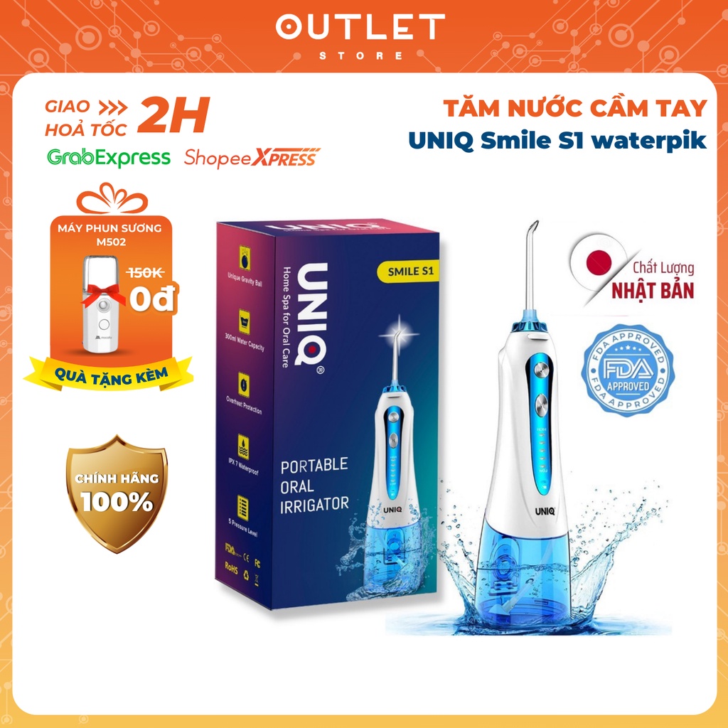 Freeship- Tăm nước cầm tay UNIQ Smile S1 waterpik động cơ Nhật Bản siêu bền máy vệ sinh răng miệng xịt rửa làm sạch kẽ niềng 300ml mua tại đây
